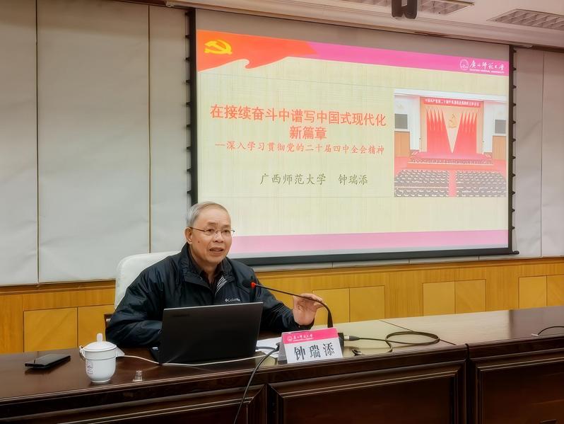 会议特邀关工委常务副主任(学校原副校长)、马克思主义理论研究领域的知名专家钟瑞添教授作主旨报告。钟瑞添以《在接续奋斗中谱写中国式现代化新篇章——深入学习贯彻党的二十届四中全会精神》为题,带来了一场脉络清晰、阐述深刻的报告。他立足国家发展全局与历史纵深,系统梳理了“十四五”时期取得的重大成就及其深刻启示;深入解读了党中央关于“十五五”规划建议的战略谋划与目标展望;详细阐述了新阶段的战略任务与关键举措;并结合区域发展使命,探讨了凝聚力量、砥砺前行,确保八桂大地与全国同步基本实现社会主义现代化的实践路径。报告内容翔实、论述精辟,既有理论高度,又有现实温度,为老同志们深入理解国家发展大政方针、把握时代脉搏提供了有力的思想指引。