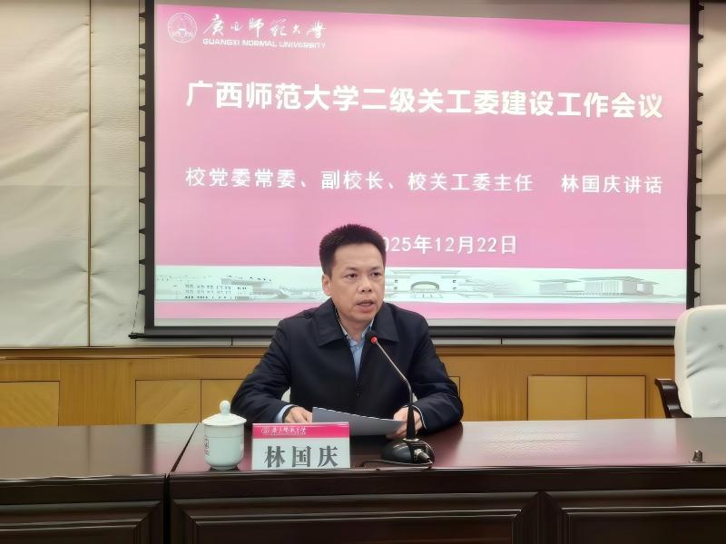 2025年12月22日下午,广西师范大学在育才校区图书馆一楼报告厅召开二级关工委建设工作会议。会议深入学习贯彻党的二十届四中全会精神和习近平总书记关于关心下一代工作的重要指示批示精神,聚焦二级关工委建设提质增效,部署下一阶段重点任务,推动学校关心下一代工作再谱新篇。校党委常委、副校长、校关工委主任林国庆出席会议并讲话,校关工委常务副主任(原学校副校长)钟瑞添主持会议。校关工委成员、委员单位负责人、各基层党委(党总支)书记、各二级学院党委副书记以及二级关工委副主任等近百人参加了会议。