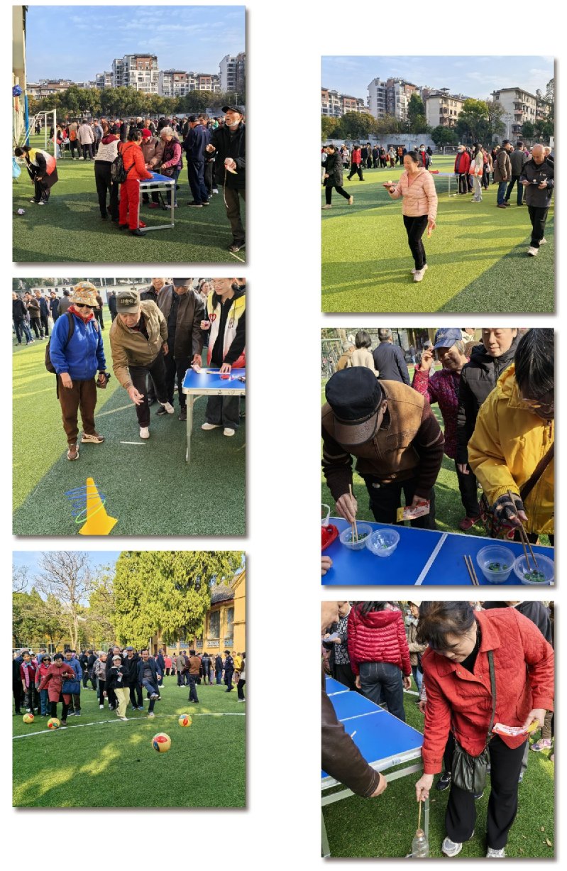 本次运动会以“快乐运动,健康迎新”为主题,由离退休工作处统筹策划。针对老同志年龄特点和身体状况,活动精心设置了“时来运转”“吉祥圈圈”“响鼓聚福”“好运玻珠”“瓶安筷至”“射门报喜”六大富有趣味性和安全性的比赛项目。考虑到冬季气候与出行便利,活动采用双校区联动模式——上午在育才校区小田径场举行,下午在王城校区离退处活动中心南面足球场开展,最大限度方便各片区老同志参与。活动前夕,离退休工作处通过自管小组层层通知、电话联络、家属协助等方式细致落实报名工作。工作人员提前布置场地、测试器材、准备应急医疗物资,并在各点位安排志愿者提供引导服务,为活动安全有序开展奠定了坚实基础。