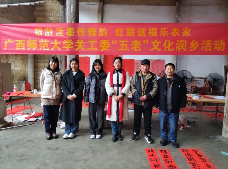 春节将至,年味渐浓。2月12日早上,广西师范大学关心下一代工作委员会(关工委)组织“五老”志愿者冒着严寒与小雨,驱车前往千年古村落——临桂区褚村,开展“银龄泼墨传雅韵 红联送福乐农家”义务书写春联活动。从上午开笔到晚上8点收工,老教师们几乎未作停歇,用一幅幅饱含深情的红联为村民送去新春祝福,在翰墨书香中传承中华优秀传统文化。